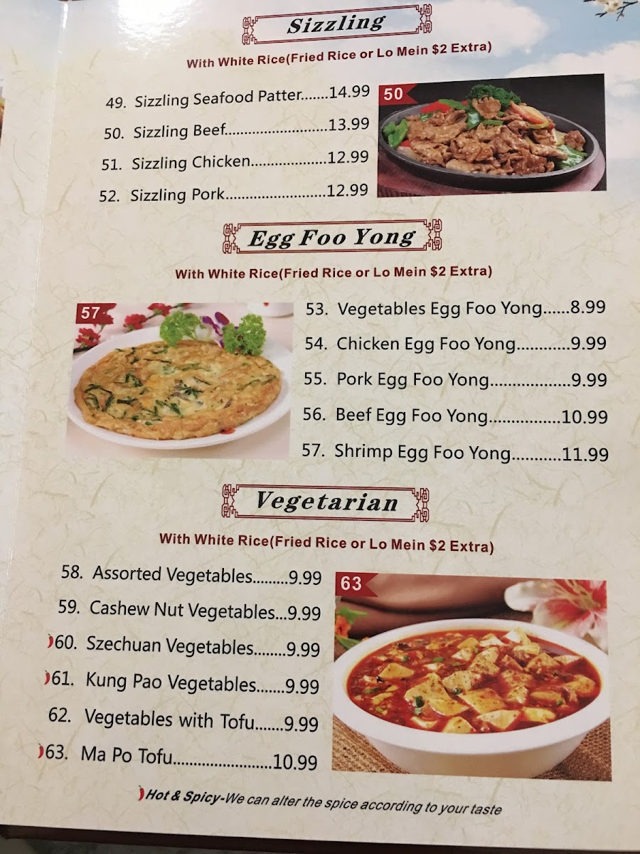 For a unique and sizzling experience, the Sizzling menu offers options like Sizzling Beef and Sizzling Seafood Platter, both at $12.99. Vegetarian dishes, including Szechuan Vegetables and Vegetables W Tofu, provide flavorful, meat-free choices at $8.99. To wash it all down, you can enjoy a refreshing beverage from their Beverage menu, including soda, coffee, and bottled tea.