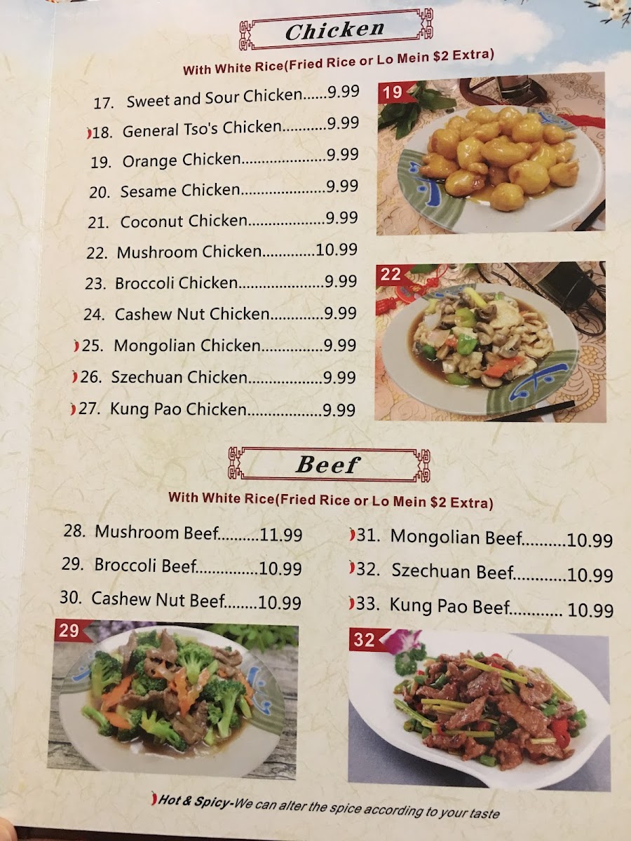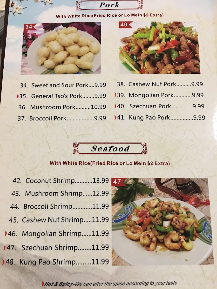The Chicken menu boasts favorites like Sweet & Sour Chicken and General Tso’s Chicken for $9.99, while the Beef and Pork sections feature tasty options like Mushroom Beef and Cashew Nut Pork, priced around $10.99. Seafood lovers can indulge in options like Coconut Shrimp or Mongolian Shrimp, priced between $10.99 and $12.99.