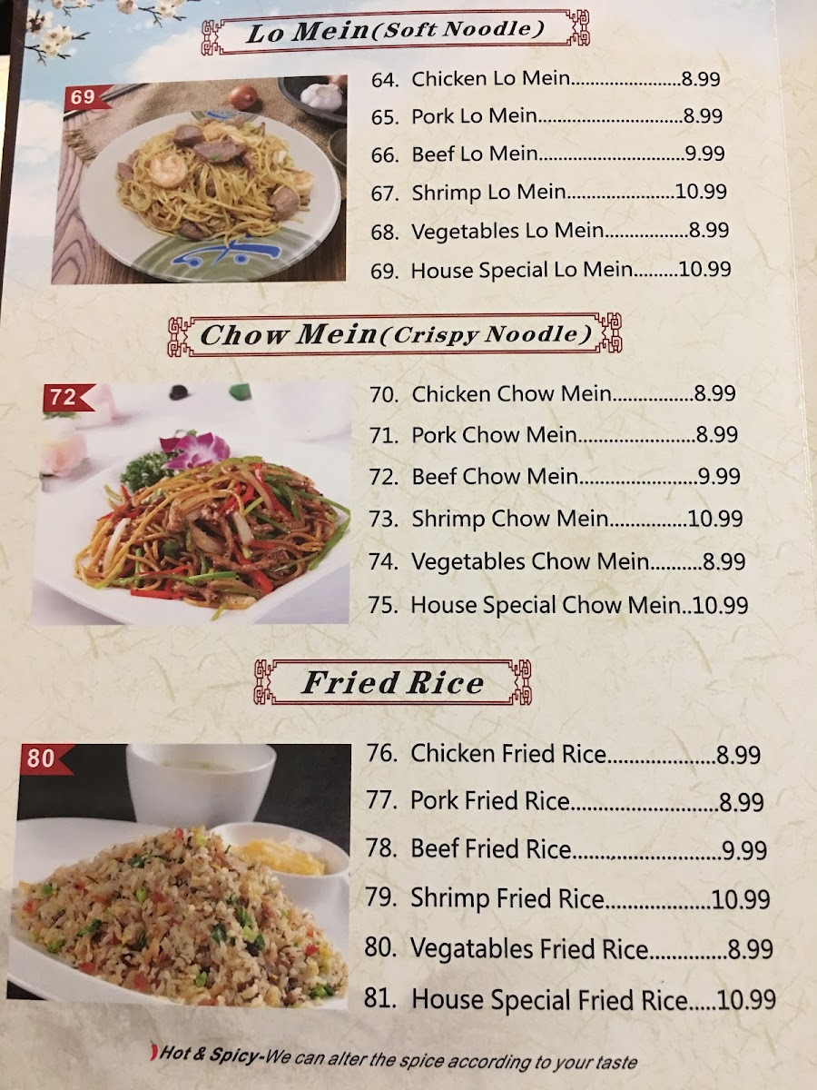 The Lo Mein and Chow Mein sections present classic stir-fried noodle dishes, including options like Chicken Lo Mein for $7.99 and Beef Chow Mein for $8.99, ensuring there's something for everyone. Fried Rice comes in several varieties, including Chicken Fried Rice and Shrimp Fried Rice, both priced around $7.99.